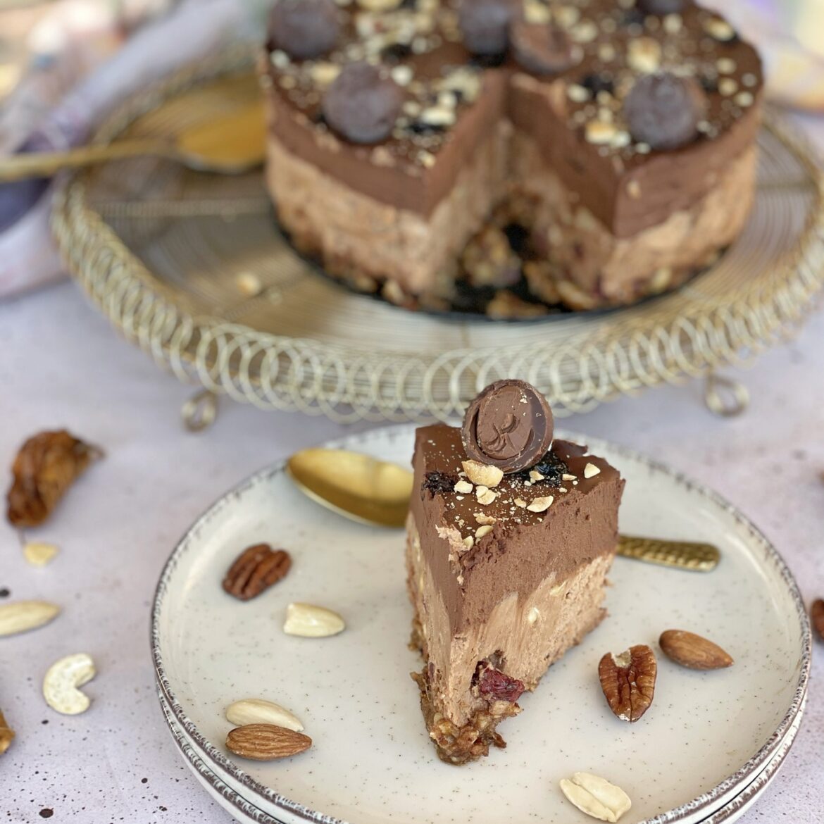 Zagrijete kokosovo mlijeko, dodate čokoladu i istopite. Prelijete preko kore i lagano ubacite višnje. Ostavite da se malo stisne i onda pospite sa Hanu miksom, Lindor kuglicama i uživajte