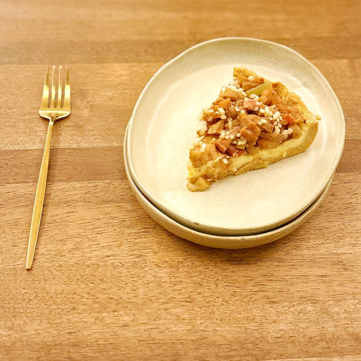 Jabuke nasjeckajte i stavite u tavu u kojoj ste istopili maslac. Krčkajte 15-ak minuta na laganoj temperaturi i na kraju dodajte agavu i cimet. Stavite jabuke preko kreme i ohladite makar sat vremena. Pospite bademe preko. Uživajte.
