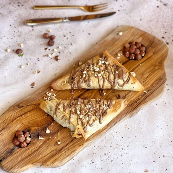 Koru raširite, namažite sa premazom i preklopite sa strana. Premažite opet tako presavijenu koru, stavite nadjev, lješnjak i urolajte kao na snimku. Pecite na 220° dok ne porumeni. Vruće prelijete istopljenom čokoladom i lješnjakom. Uživajte